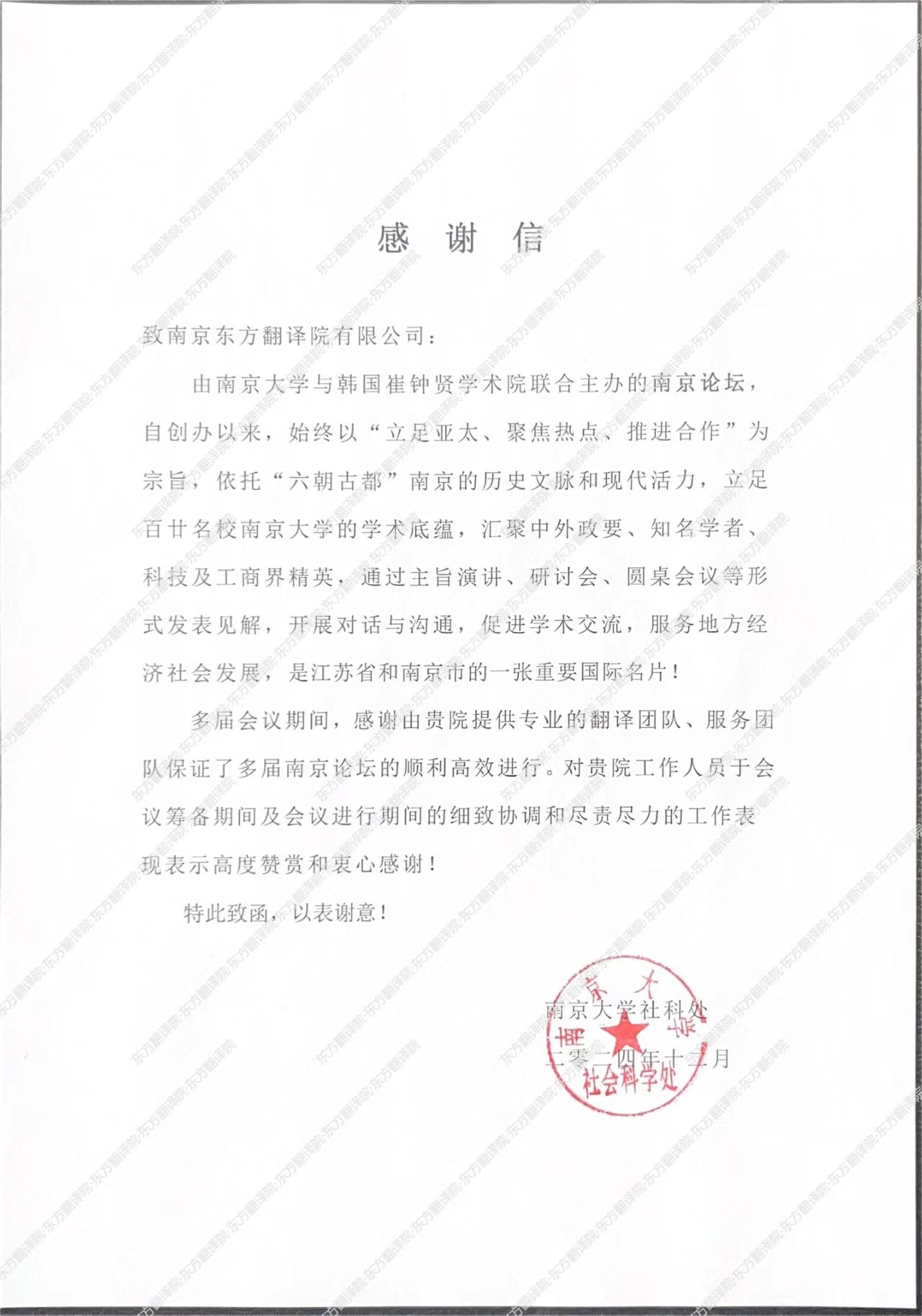南京大学社会科学社 感谢信
